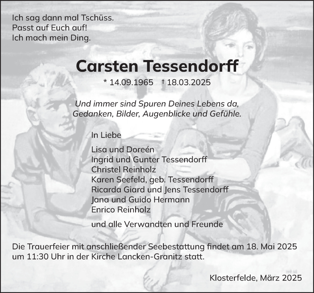 Hier finden Sie alle Traueranzeigen aus der Zeitung, die bisher für Carsten Tessendorff erschienen sind. Weitere Traueranzeigen, die in der Zeitung erscheinen, werden hier ebenfalls aufgelistet