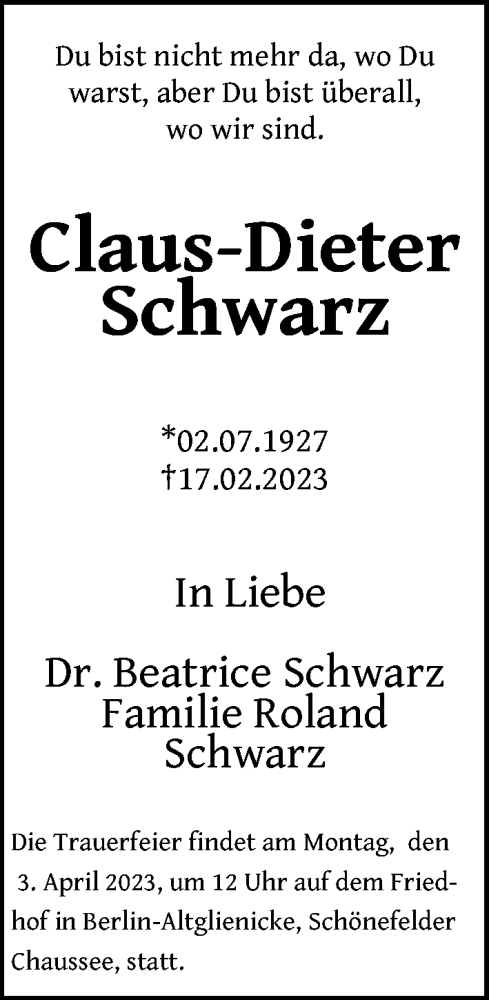 Hier finden Sie alle Traueranzeigen aus der Zeitung, die bisher für Claus-Dieter Schwarz erschienen sind. Weitere Traueranzeigen, die in der Zeitung erscheinen, werden hier ebenfalls aufgelistet