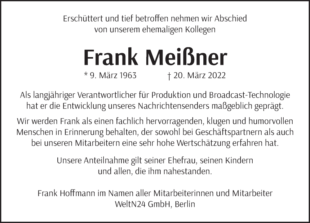 Hier finden Sie alle Traueranzeigen aus der Zeitung, die bisher für Frank Meißner erschienen sind. Weitere Traueranzeigen, die in der Zeitung erscheinen, werden hier ebenfalls aufgelistet
