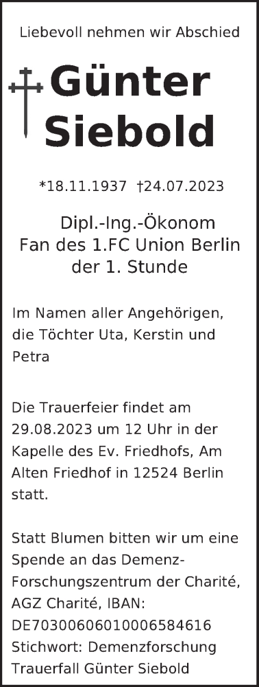Hier finden Sie alle Traueranzeigen aus der Zeitung, die bisher für Günter Siebold erschienen sind. Weitere Traueranzeigen, die in der Zeitung erscheinen, werden hier ebenfalls aufgelistet