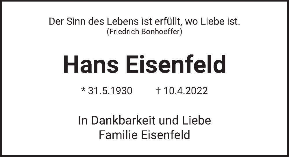 Hier finden Sie alle Traueranzeigen aus der Zeitung, die bisher für Hans Eisenfeld erschienen sind. Weitere Traueranzeigen, die in der Zeitung erscheinen, werden hier ebenfalls aufgelistet