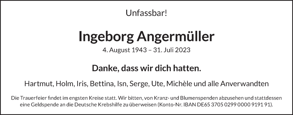 Hier finden Sie alle Traueranzeigen aus der Zeitung, die bisher für Ingeborg Angermüller erschienen sind. Weitere Traueranzeigen, die in der Zeitung erscheinen, werden hier ebenfalls aufgelistet