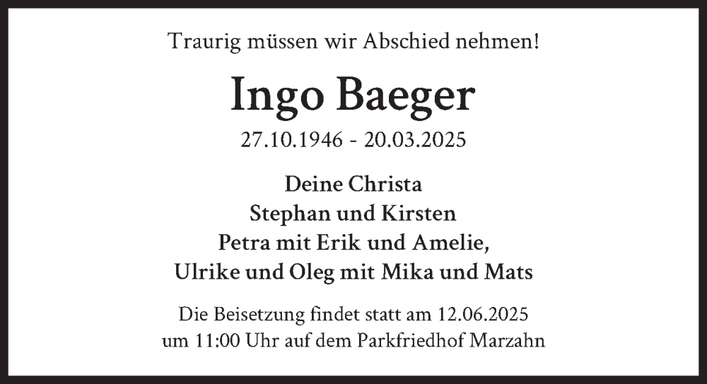 Hier finden Sie alle Traueranzeigen aus der Zeitung, die bisher für Ingo Baeger erschienen sind. Weitere Traueranzeigen, die in der Zeitung erscheinen, werden hier ebenfalls aufgelistet