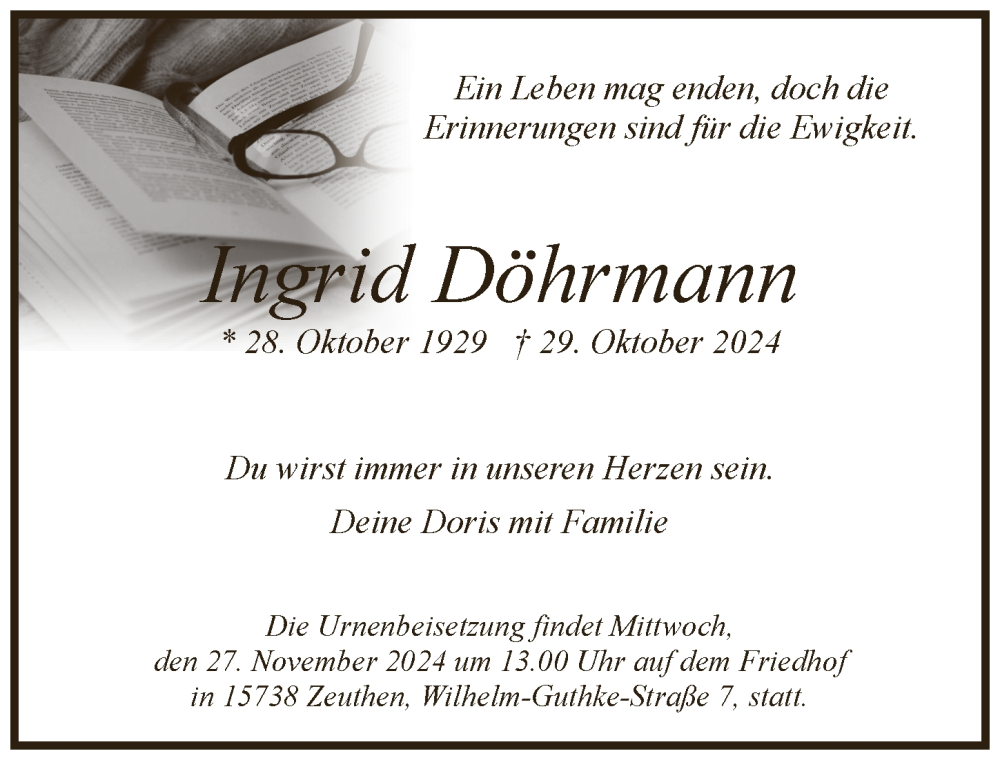 Hier finden Sie alle Traueranzeigen aus der Zeitung, die bisher für Ingrid Döhrmann erschienen sind. Weitere Traueranzeigen, die in der Zeitung erscheinen, werden hier ebenfalls aufgelistet