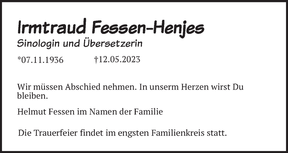 Hier finden Sie alle Traueranzeigen aus der Zeitung, die bisher für Irmtraud Fessen-Henjes erschienen sind. Weitere Traueranzeigen, die in der Zeitung erscheinen, werden hier ebenfalls aufgelistet