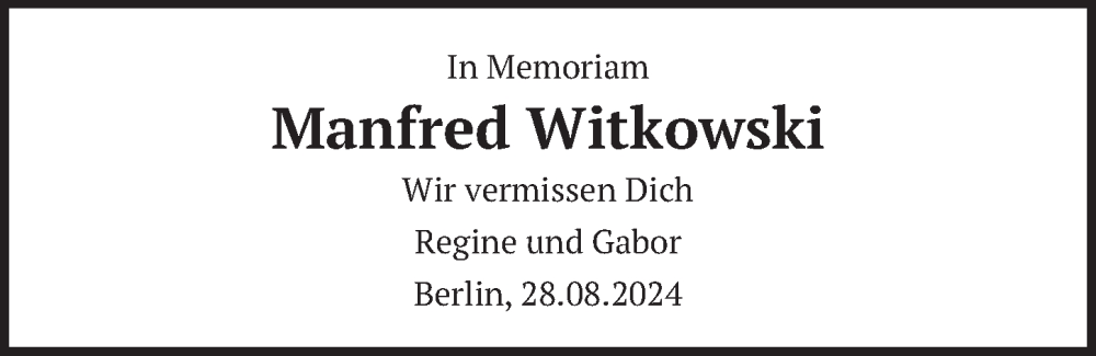 Hier finden Sie alle Traueranzeigen aus der Zeitung, die bisher für Manfred Witkowski erschienen sind. Weitere Traueranzeigen, die in der Zeitung erscheinen, werden hier ebenfalls aufgelistet