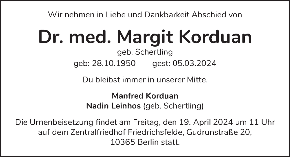 Hier finden Sie alle Traueranzeigen aus der Zeitung, die bisher für Margit Korduan erschienen sind. Weitere Traueranzeigen, die in der Zeitung erscheinen, werden hier ebenfalls aufgelistet