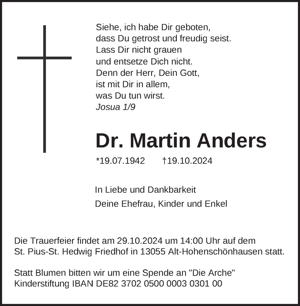Hier finden Sie alle Traueranzeigen aus der Zeitung, die bisher für Martin Anders erschienen sind. Weitere Traueranzeigen, die in der Zeitung erscheinen, werden hier ebenfalls aufgelistet