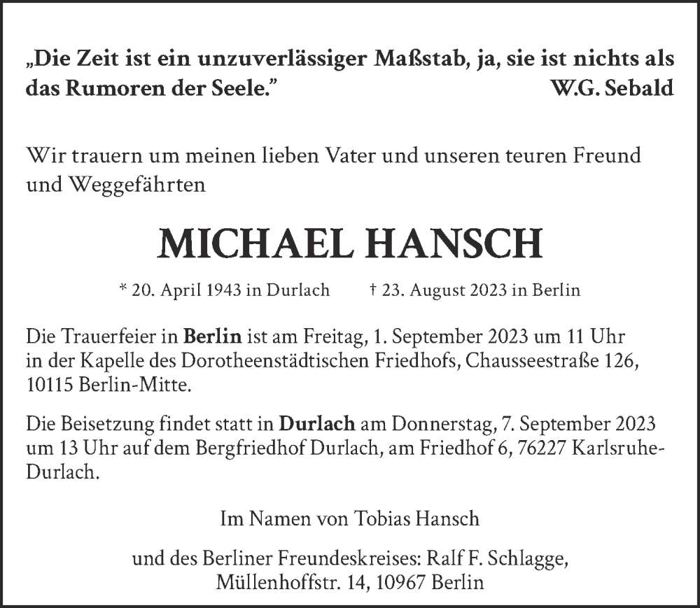 Hier finden Sie alle Traueranzeigen aus der Zeitung, die bisher für Michael Hansch erschienen sind. Weitere Traueranzeigen, die in der Zeitung erscheinen, werden hier ebenfalls aufgelistet