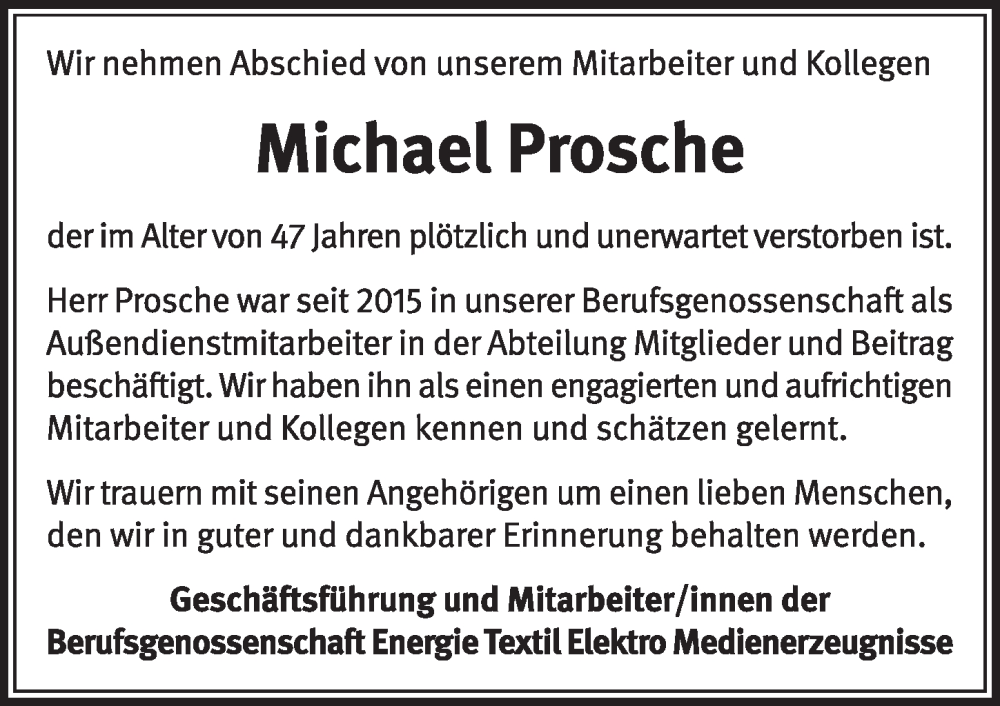 Hier finden Sie alle Traueranzeigen aus der Zeitung, die bisher für Michael Prosche erschienen sind. Weitere Traueranzeigen, die in der Zeitung erscheinen, werden hier ebenfalls aufgelistet