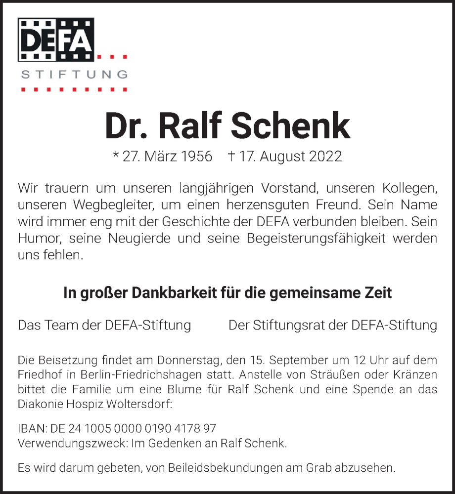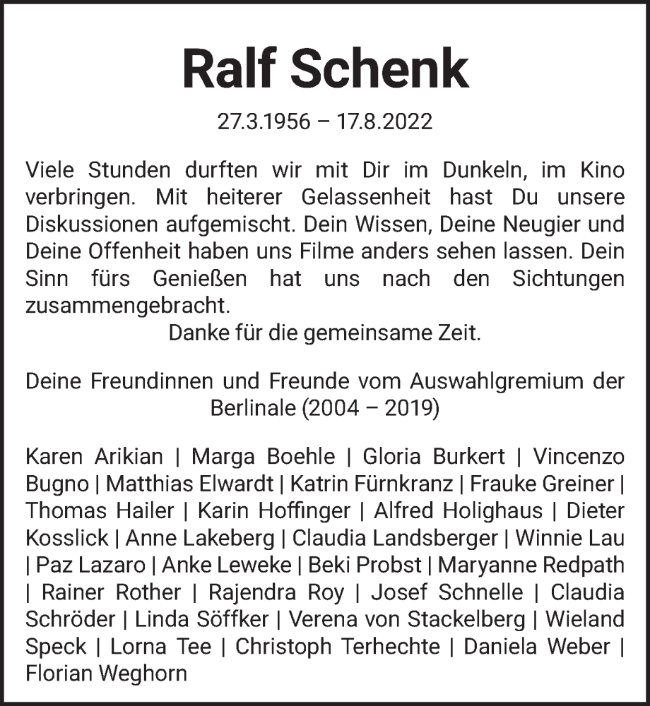 Hier finden Sie alle Traueranzeigen aus der Zeitung, die bisher für Ralf Schenk erschienen sind. Weitere Traueranzeigen, die in der Zeitung erscheinen, werden hier ebenfalls aufgelistet