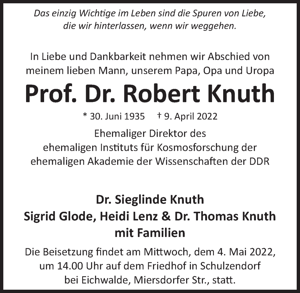 Hier finden Sie alle Traueranzeigen aus der Zeitung, die bisher für Robert Prof. Dr. Knuth erschienen sind. Weitere Traueranzeigen, die in der Zeitung erscheinen, werden hier ebenfalls aufgelistet
