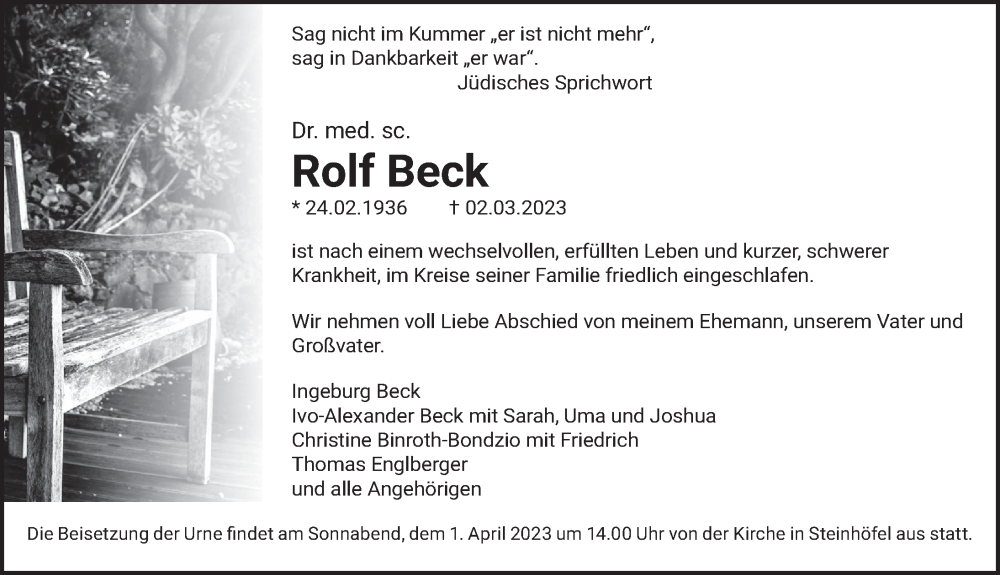 Hier finden Sie alle Traueranzeigen aus der Zeitung, die bisher für Rolf Beck erschienen sind. Weitere Traueranzeigen, die in der Zeitung erscheinen, werden hier ebenfalls aufgelistet