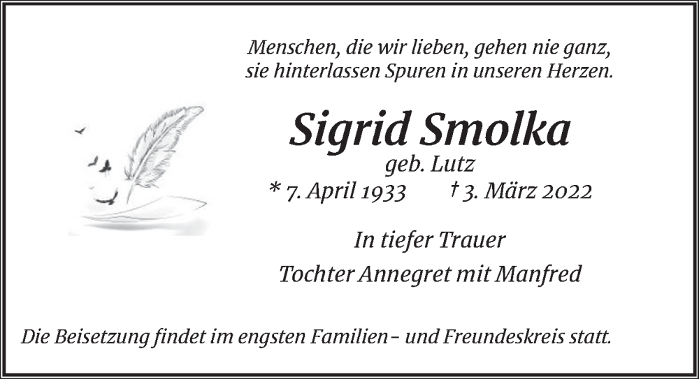 Hier finden Sie alle Traueranzeigen aus der Zeitung, die bisher für Sigrid Smolka erschienen sind. Weitere Traueranzeigen, die in der Zeitung erscheinen, werden hier ebenfalls aufgelistet