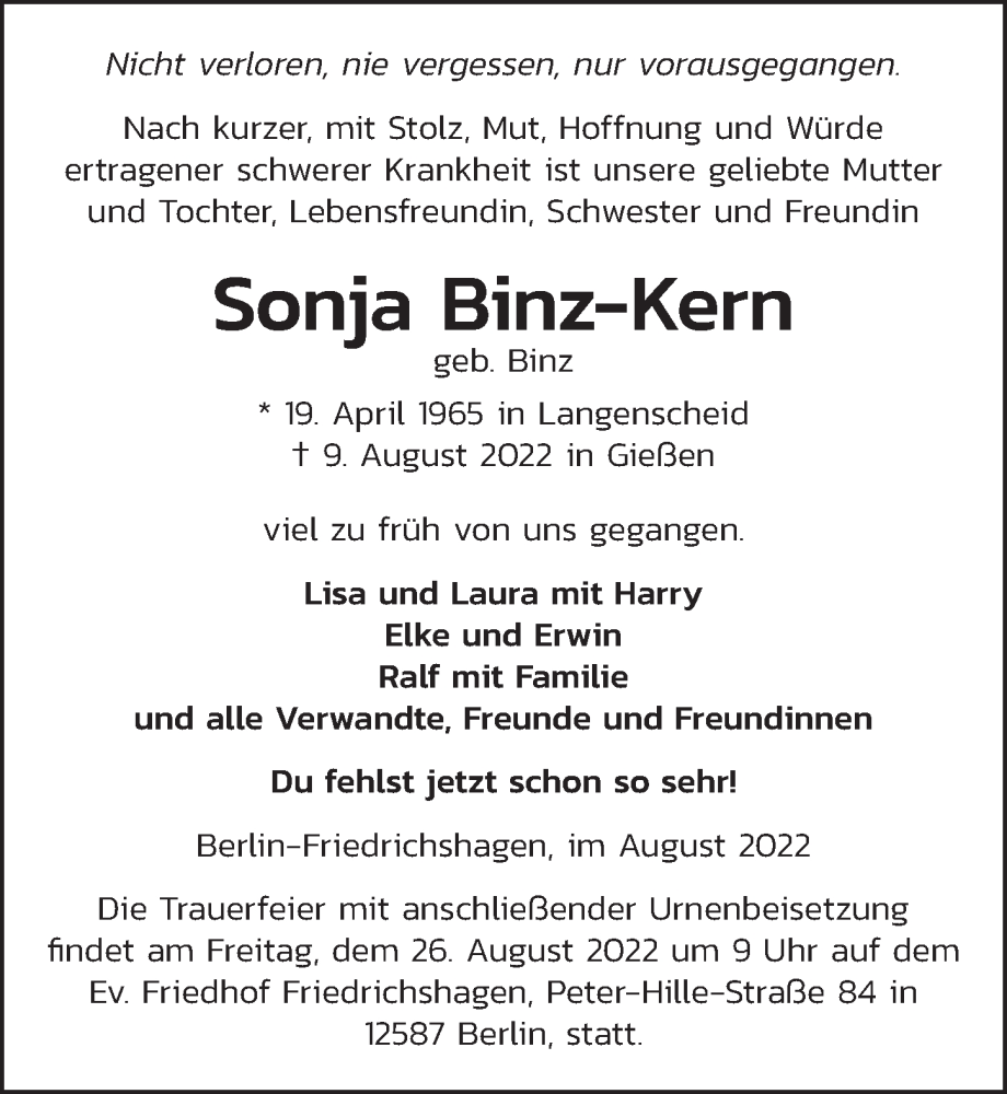 Hier finden Sie alle Traueranzeigen aus der Zeitung, die bisher für Sonja Binz-Kern erschienen sind. Weitere Traueranzeigen, die in der Zeitung erscheinen, werden hier ebenfalls aufgelistet