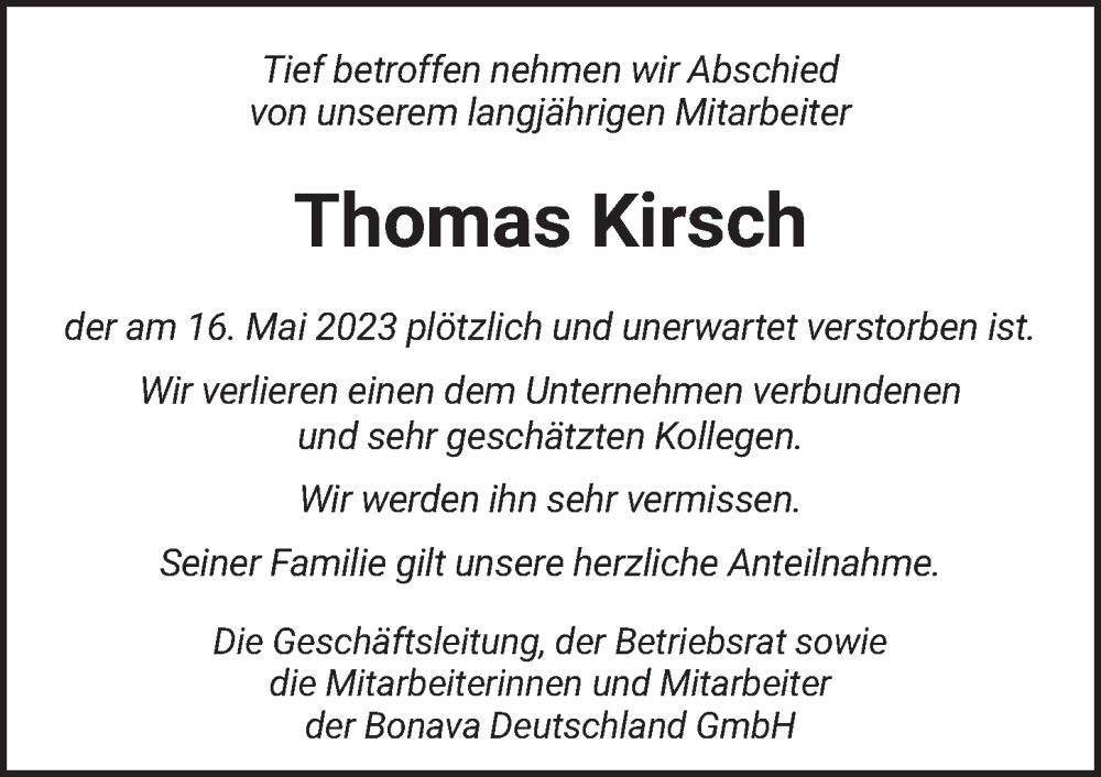 Hier finden Sie alle Traueranzeigen aus der Zeitung, die bisher für Thomas Kirsch erschienen sind. Weitere Traueranzeigen, die in der Zeitung erscheinen, werden hier ebenfalls aufgelistet