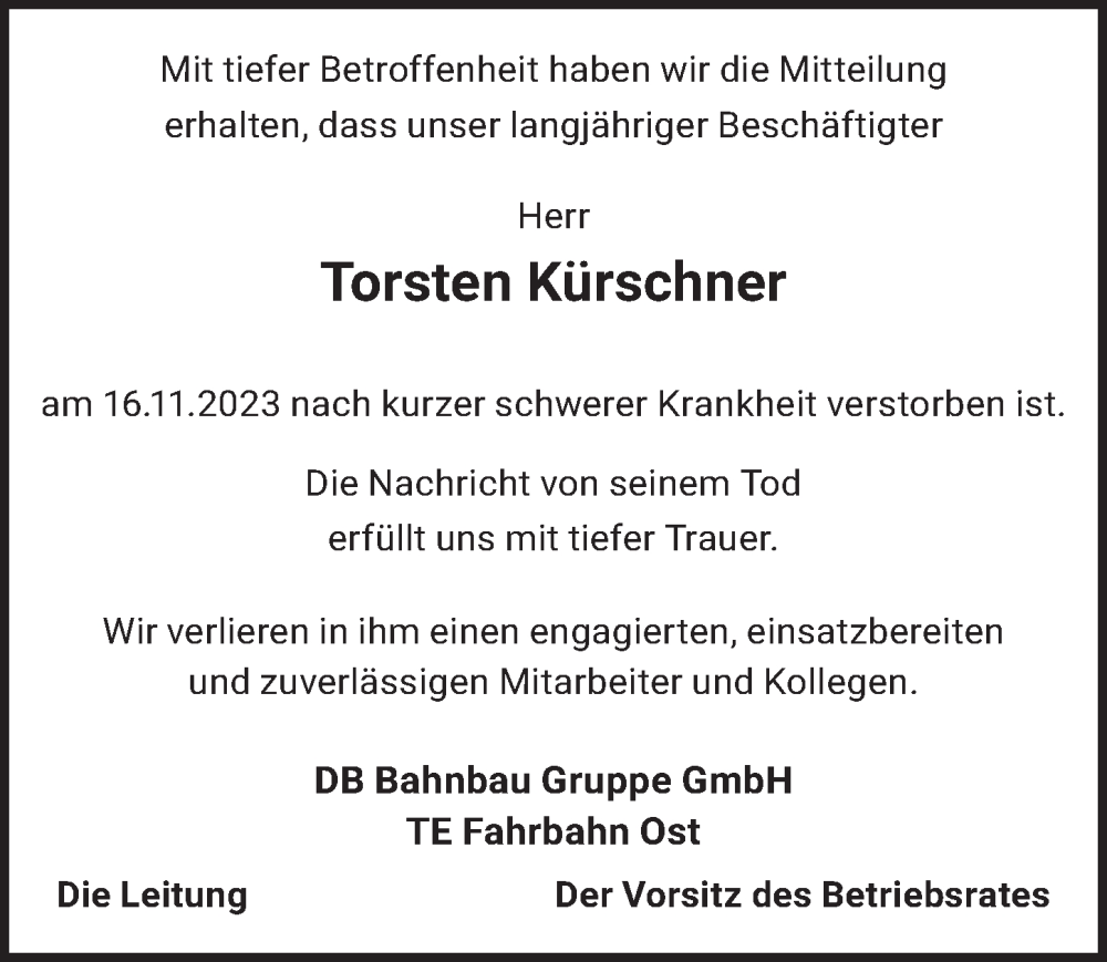 Hier finden Sie alle Traueranzeigen aus der Zeitung, die bisher für Torsten Kürschner erschienen sind. Weitere Traueranzeigen, die in der Zeitung erscheinen, werden hier ebenfalls aufgelistet