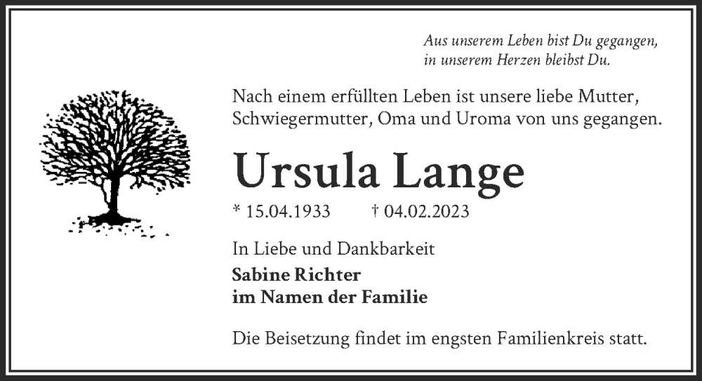 Hier finden Sie alle Traueranzeigen aus der Zeitung, die bisher für Ursula Lange erschienen sind. Weitere Traueranzeigen, die in der Zeitung erscheinen, werden hier ebenfalls aufgelistet
